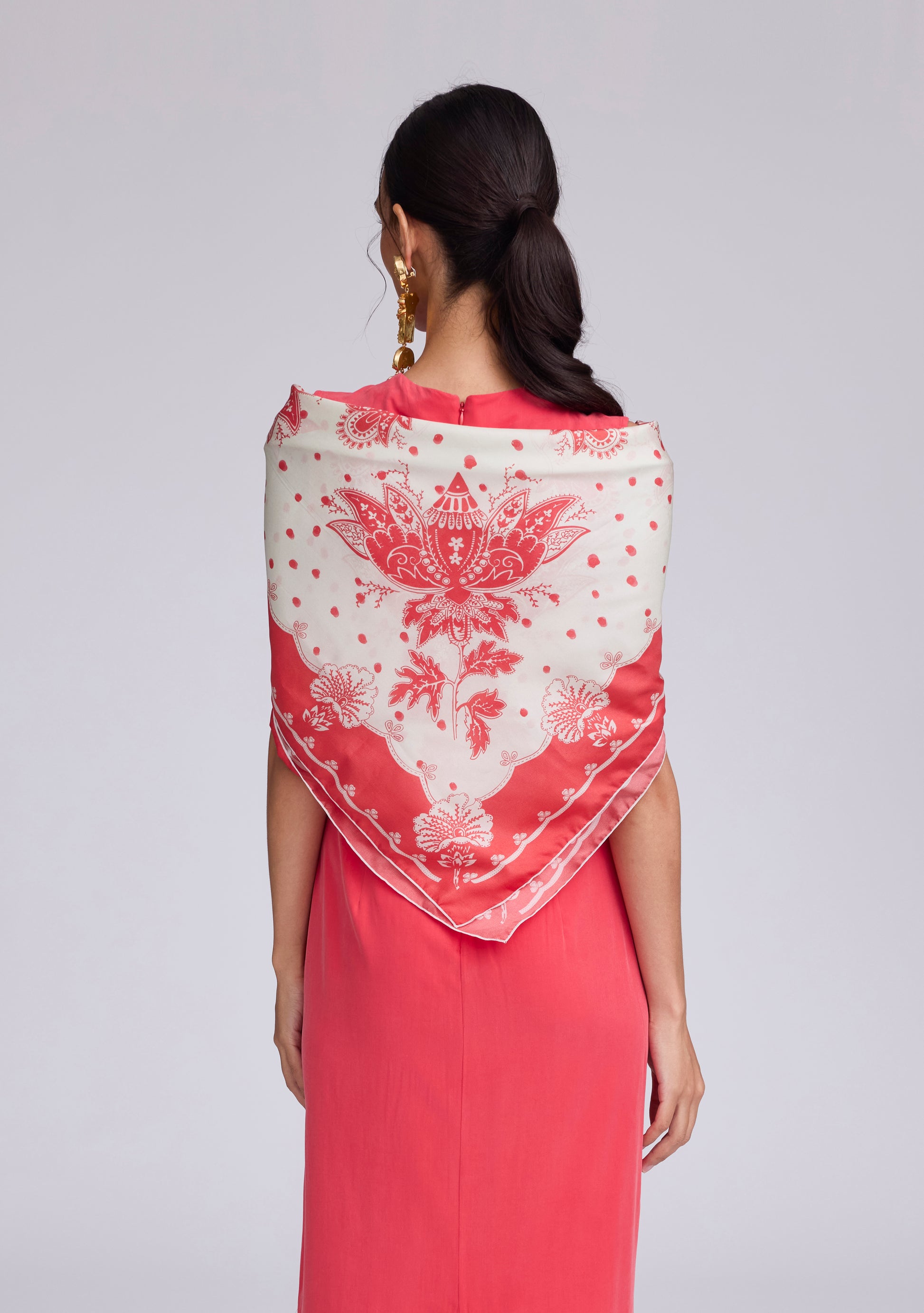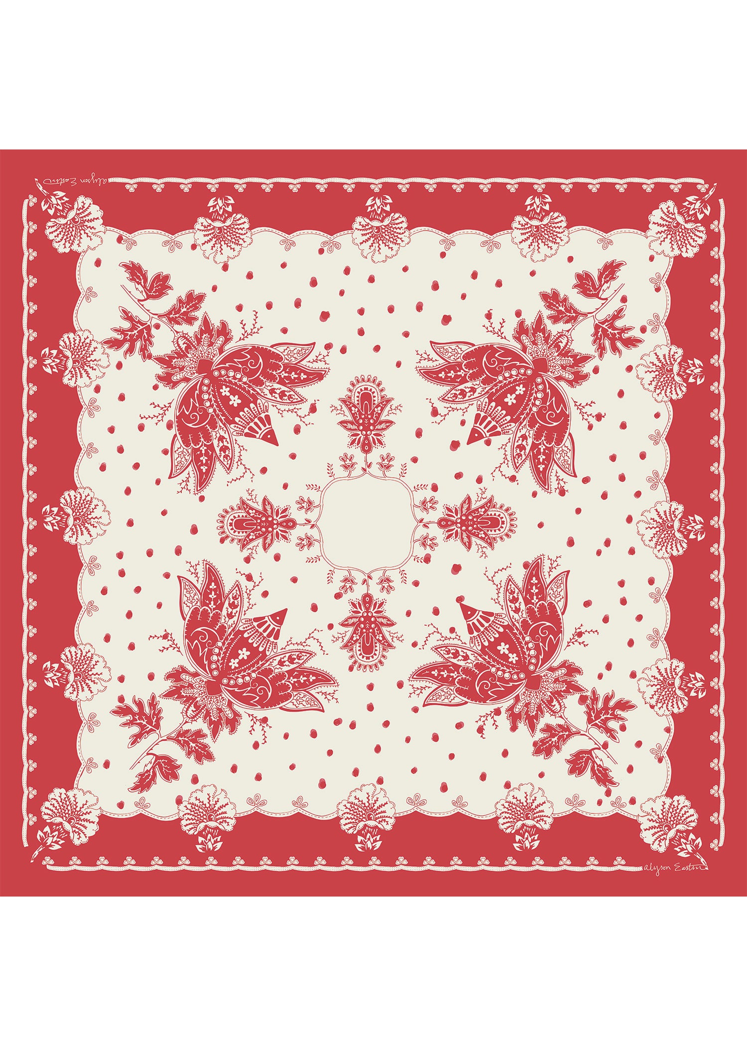 A wearable piece of art. This 100% silk scarf features an original, hand-drawn floral illustration. Rendered in soft ivory and vibrant tomato red, the intricate pattern blends classic botanical motifs with playful polka dots and delicate borders. Lightweight with a fluid drape and subtle sheen, it adds a personal, elevated touch to any look—whether worn around the neck, shoulders, or tied to a bag.