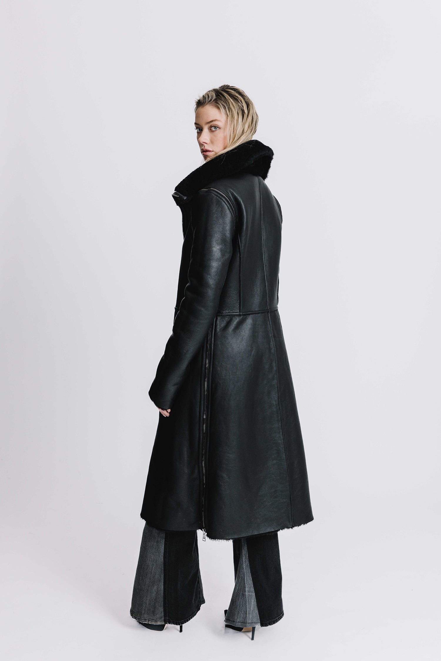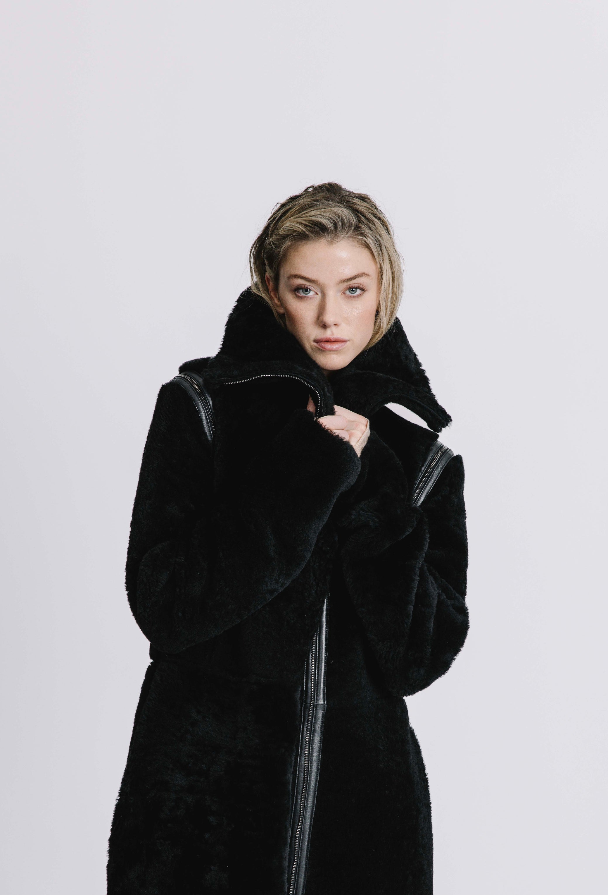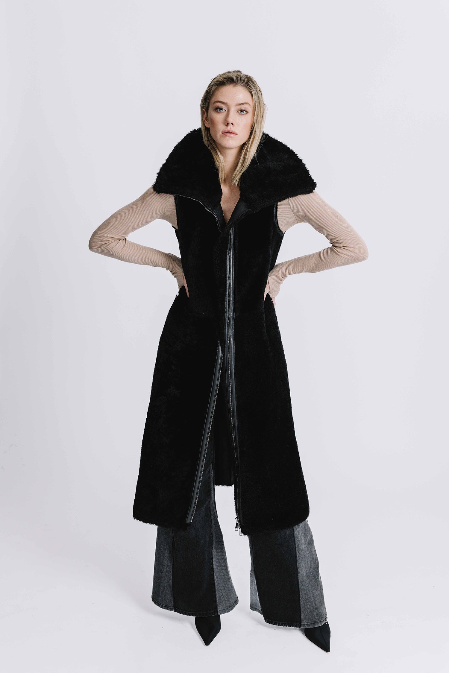 Crafted from 100% soft, luxe shearling, this statement coat offers both warmth and versatility. Designed with zip-off sleeves for effortless transformation, it can be worn long or as a vest. The fully reversible construction reveals a sleek, finished leather side, giving you two looks in one - plush texture or polished edge. Finished with a full front zip and an elongated silhouette, this piece embodies timeless luxury and modern functionality.