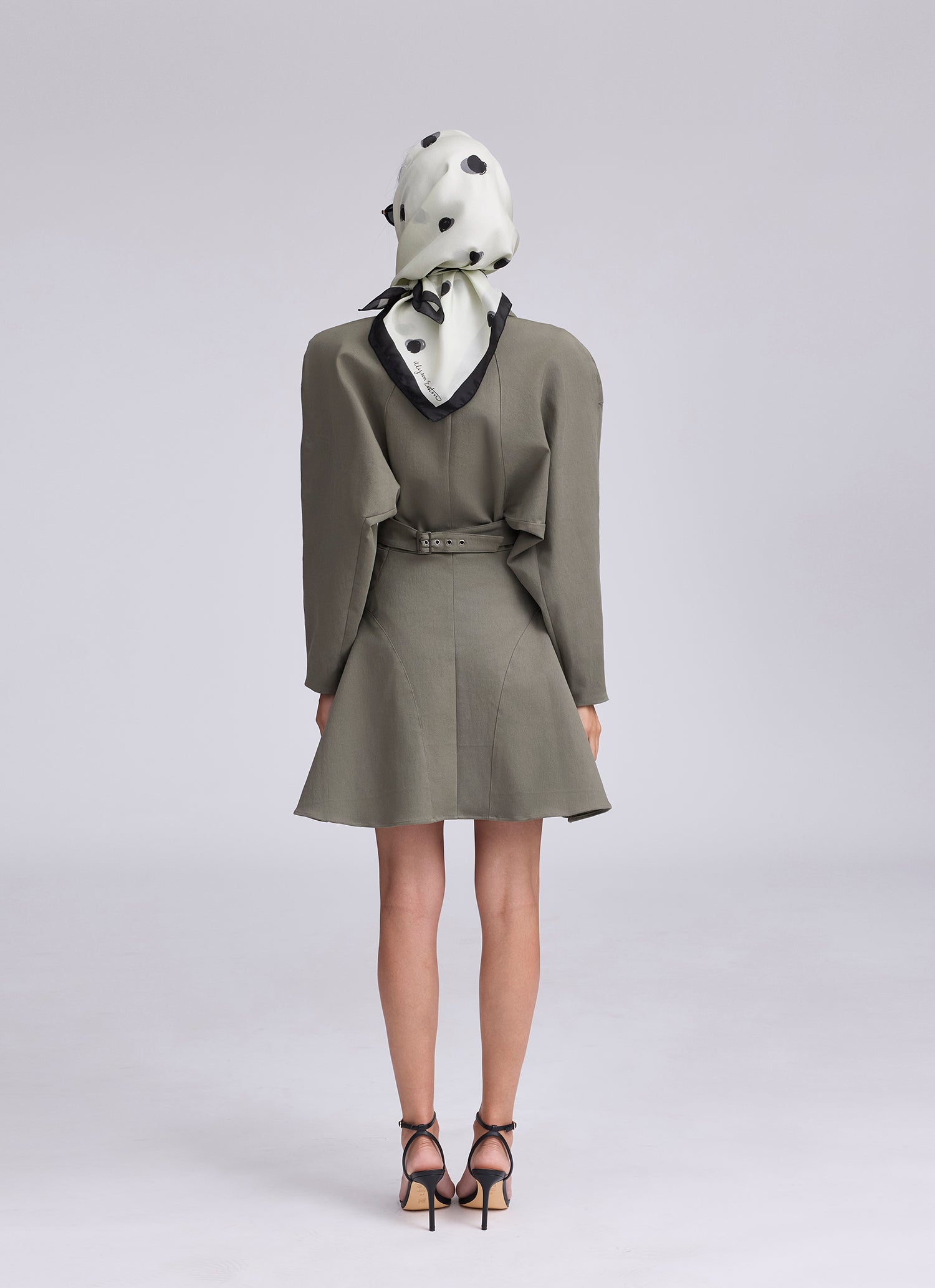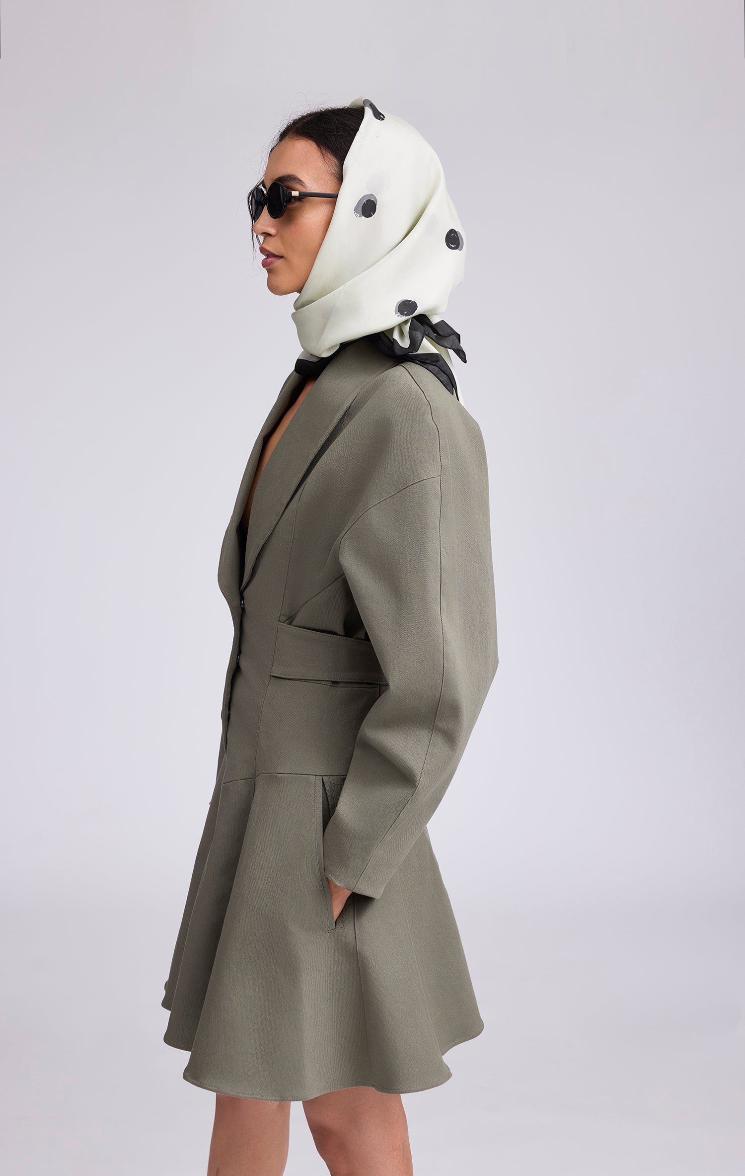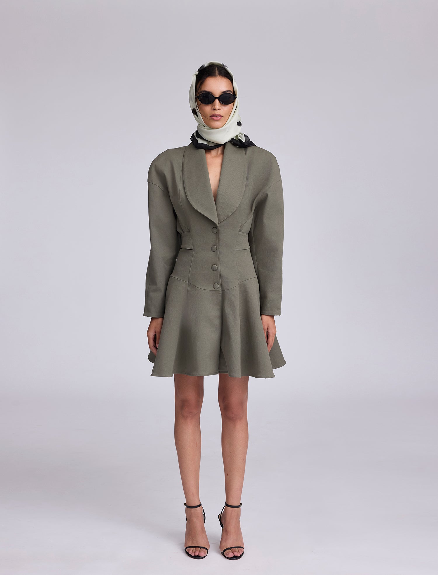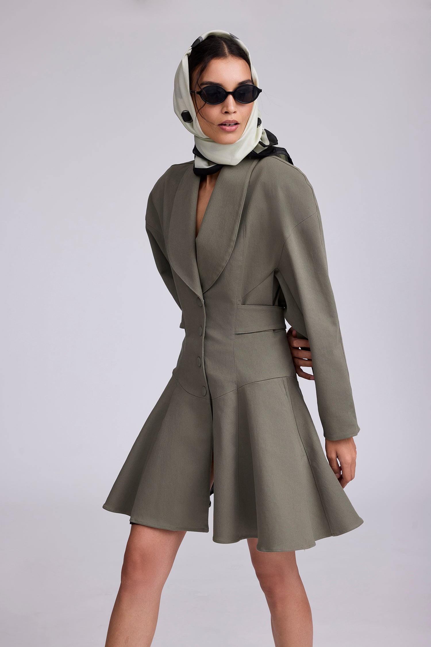 The Cindy Dress reimagines tailoring with a feminine twist. Made from stretch cotton twill, it features sculptural shoulders, a cinched waist, and a flared mini skirt for dramatic movement. Covered buttons and a curved lapel add refined structure, while the full-length sleeves ground the silhouette in quiet strength. Effortlessly bold—just like the women who wear it.