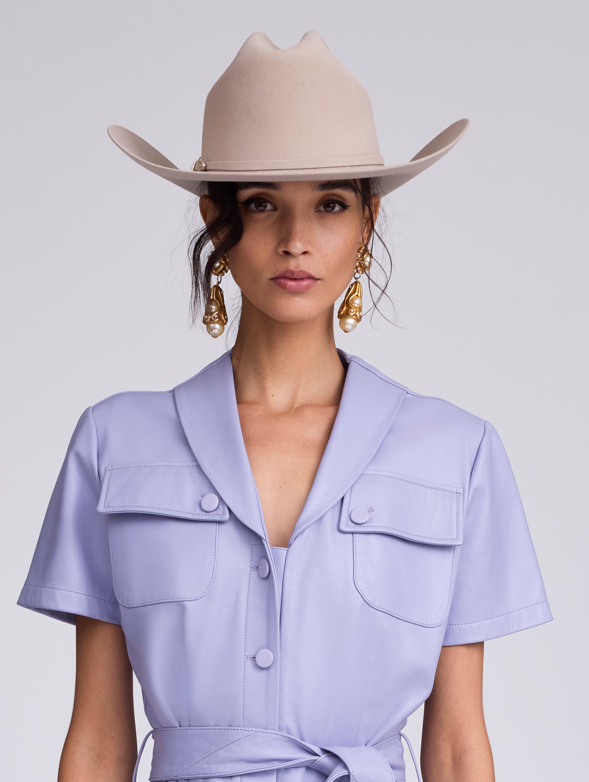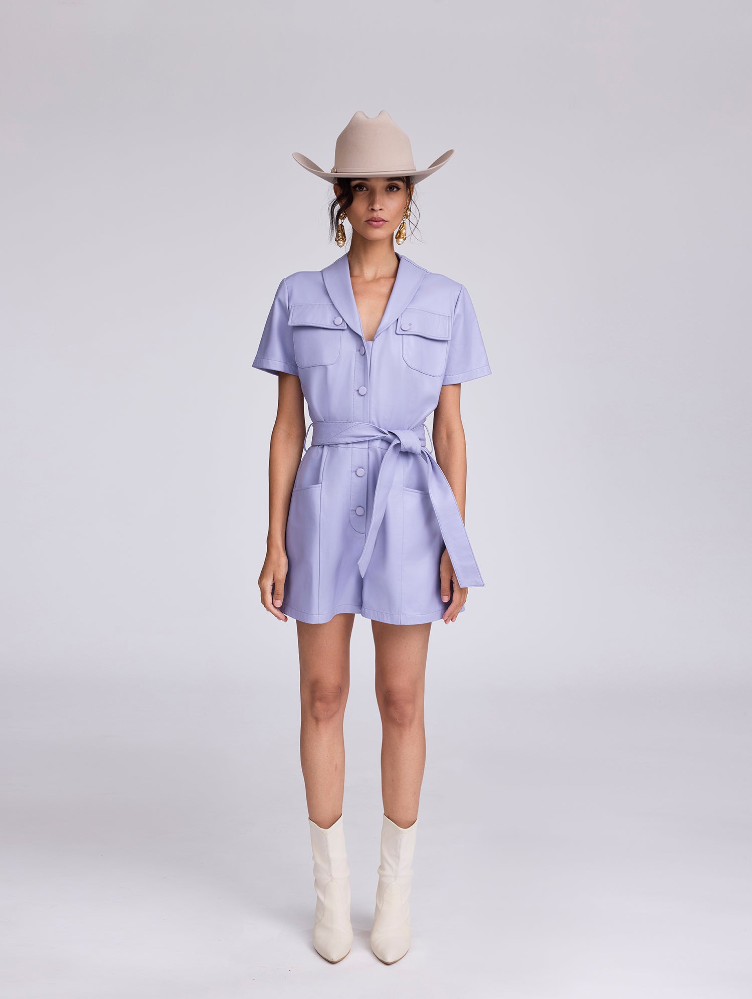 A modern one-piece with Western undertones, the Crema Romper is crafted from supple Italian leather in a soft lilac hue. Featuring a tailored collar, front patch pockets, snap closures, and a removable self-tie belt, it blends utility with feminine structure. Polished yet playful—this is effortless dressing with a bold edge.
