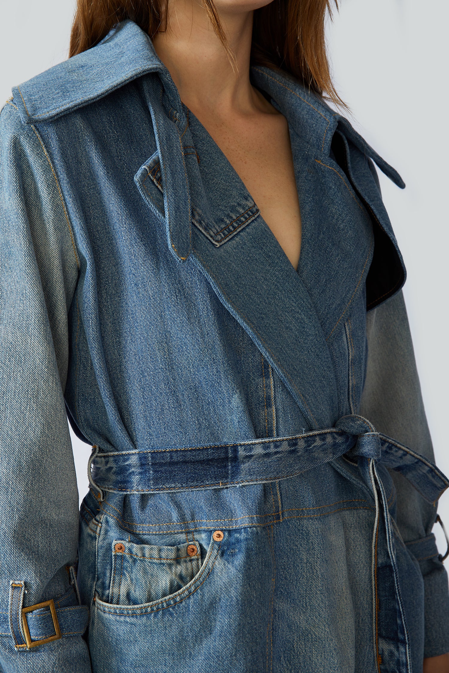 Our classic trench coat, made from 5 pairs of men's vintage denim. Featuring 4-pocket construction, back slit, and tie waist.