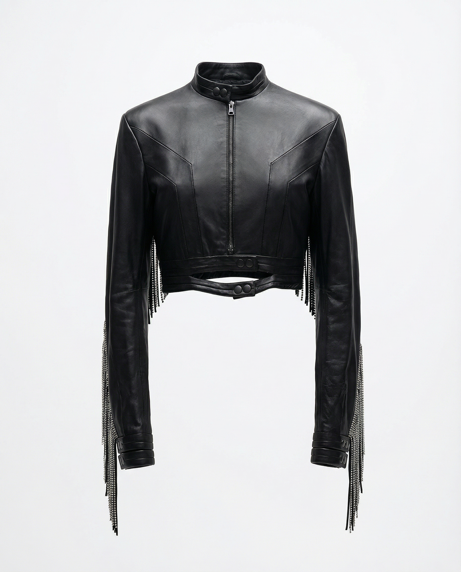 Created with our friends at Daniel Diamond in Nashville, this limited-edition jacket blends refined tailoring with bold, western-inspired edge. Crafted in Italy from buttery-soft lambskin leather, the silhouette is based on one of Alyson Eastman’s signature jackets and finished with Daniel Diamond’s iconic rhinestone fringe.