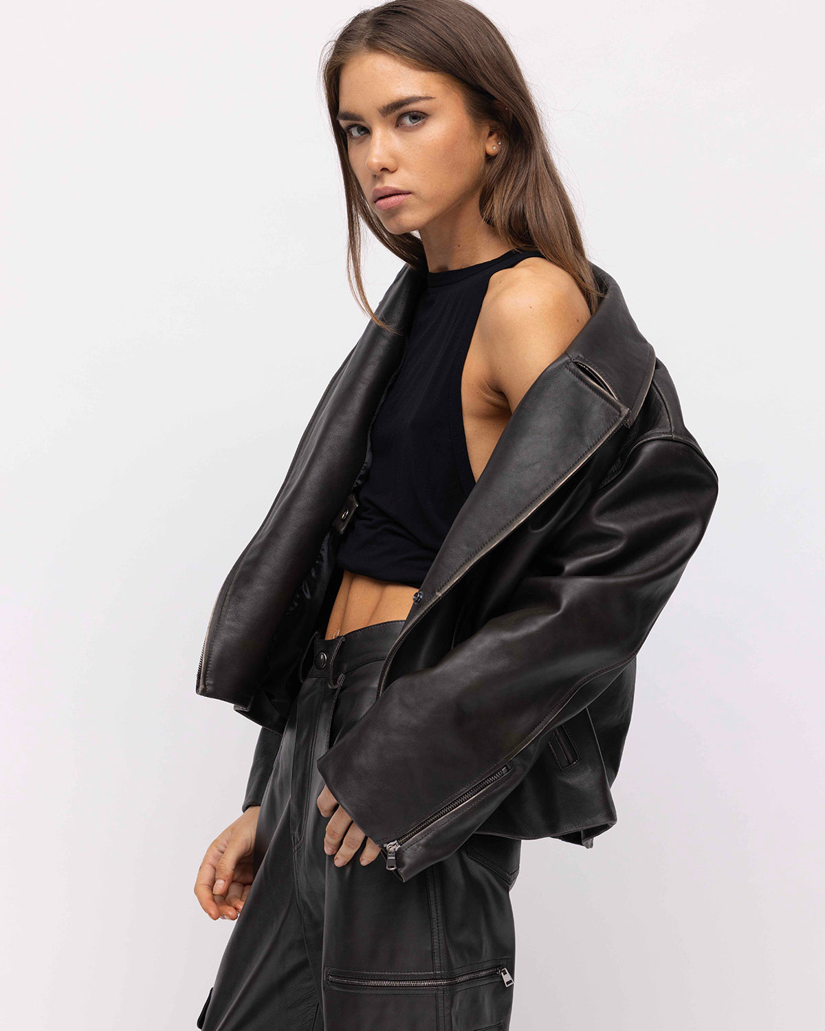 Polina is wearing a size S. This jacket fits a bit oversized.