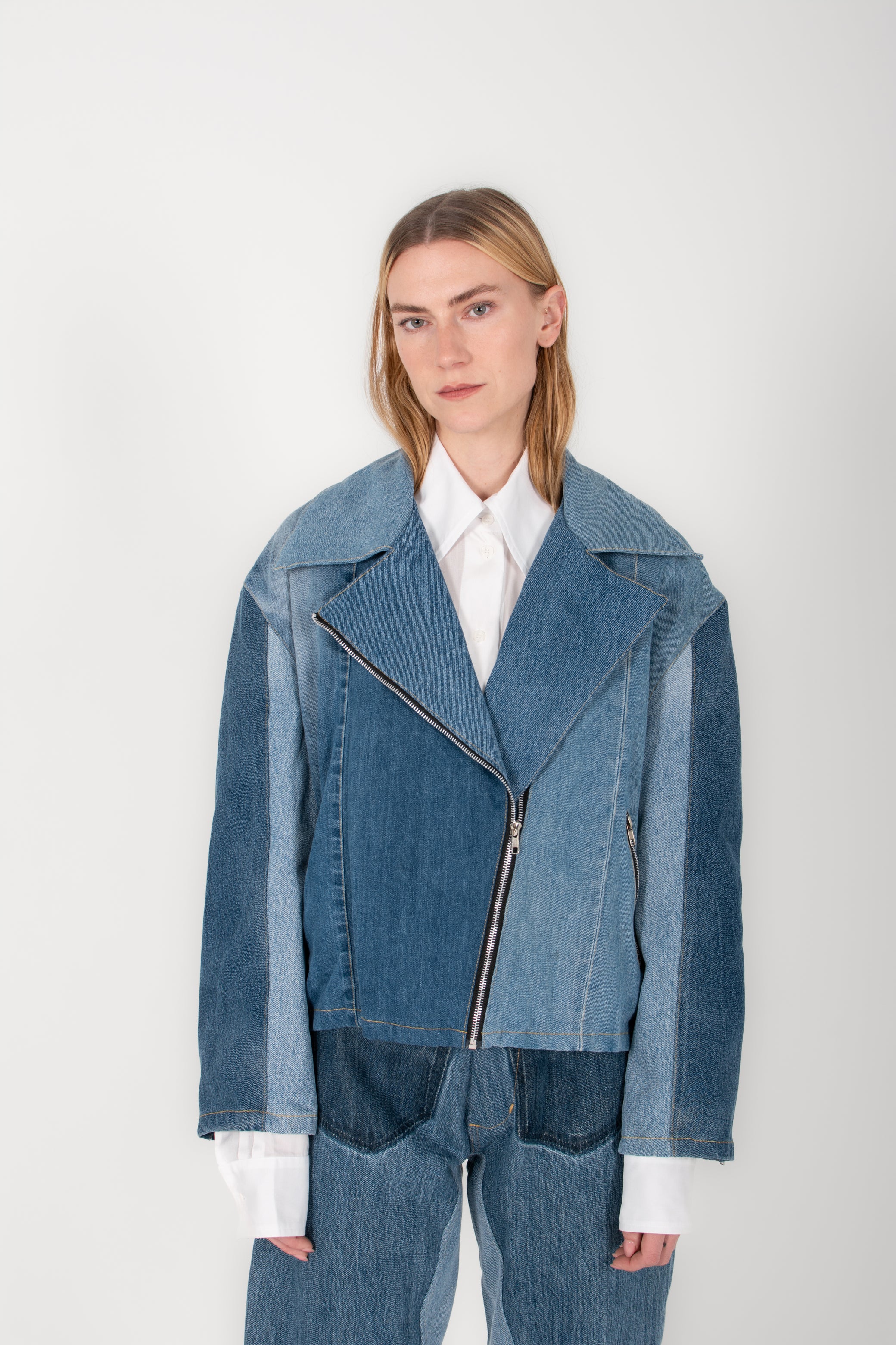An elevated take on the classic biker, the Emz Jacket is crafted from repurposed vintage denim—each piece one-of-a-kind. Featuring a relaxed, slightly oversized fit with angled seams, raw edges, and subtle contrast paneling, it blends utility with quiet rebellion. Made from 100% cotton, this is effortless structure with a story behind every thread.