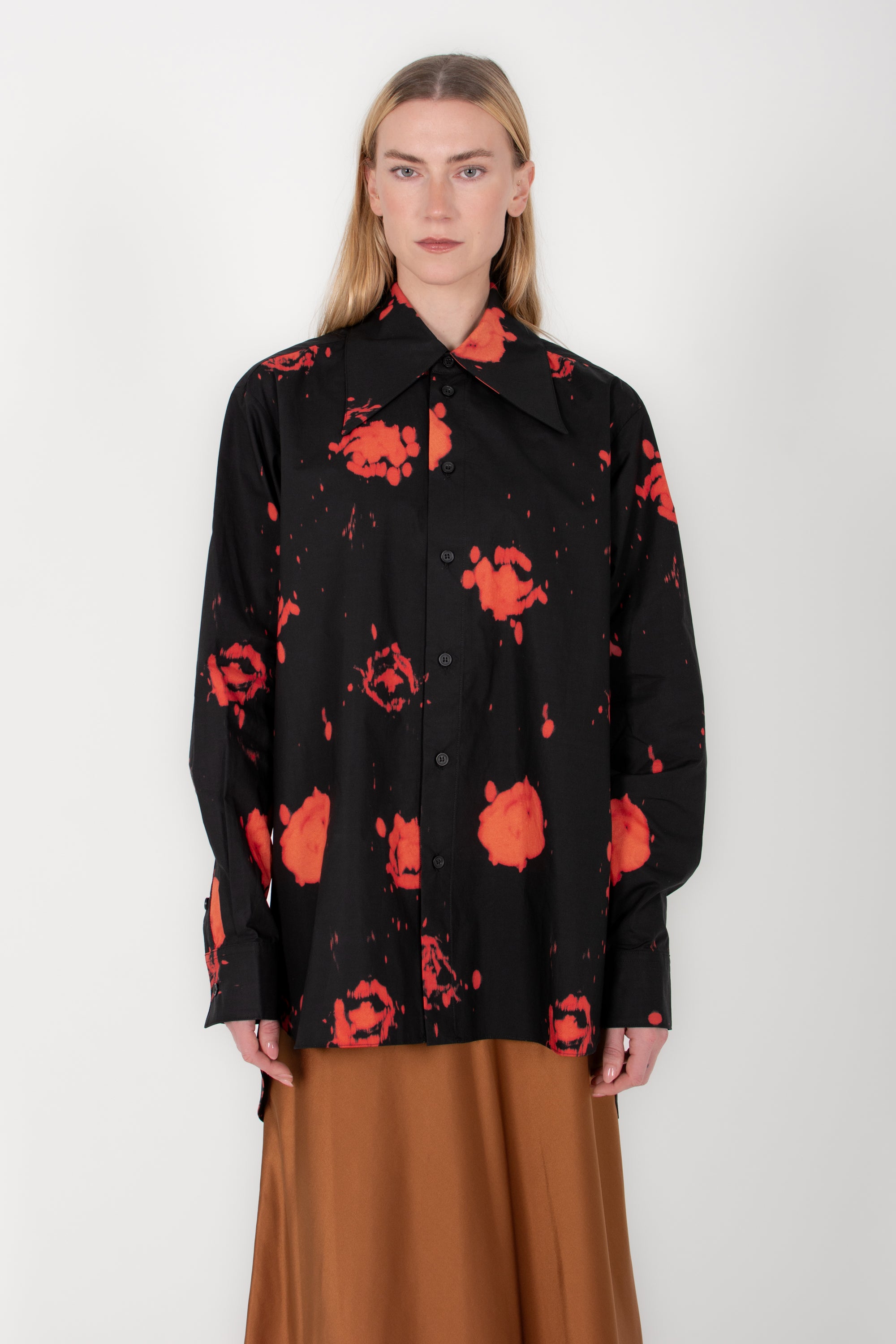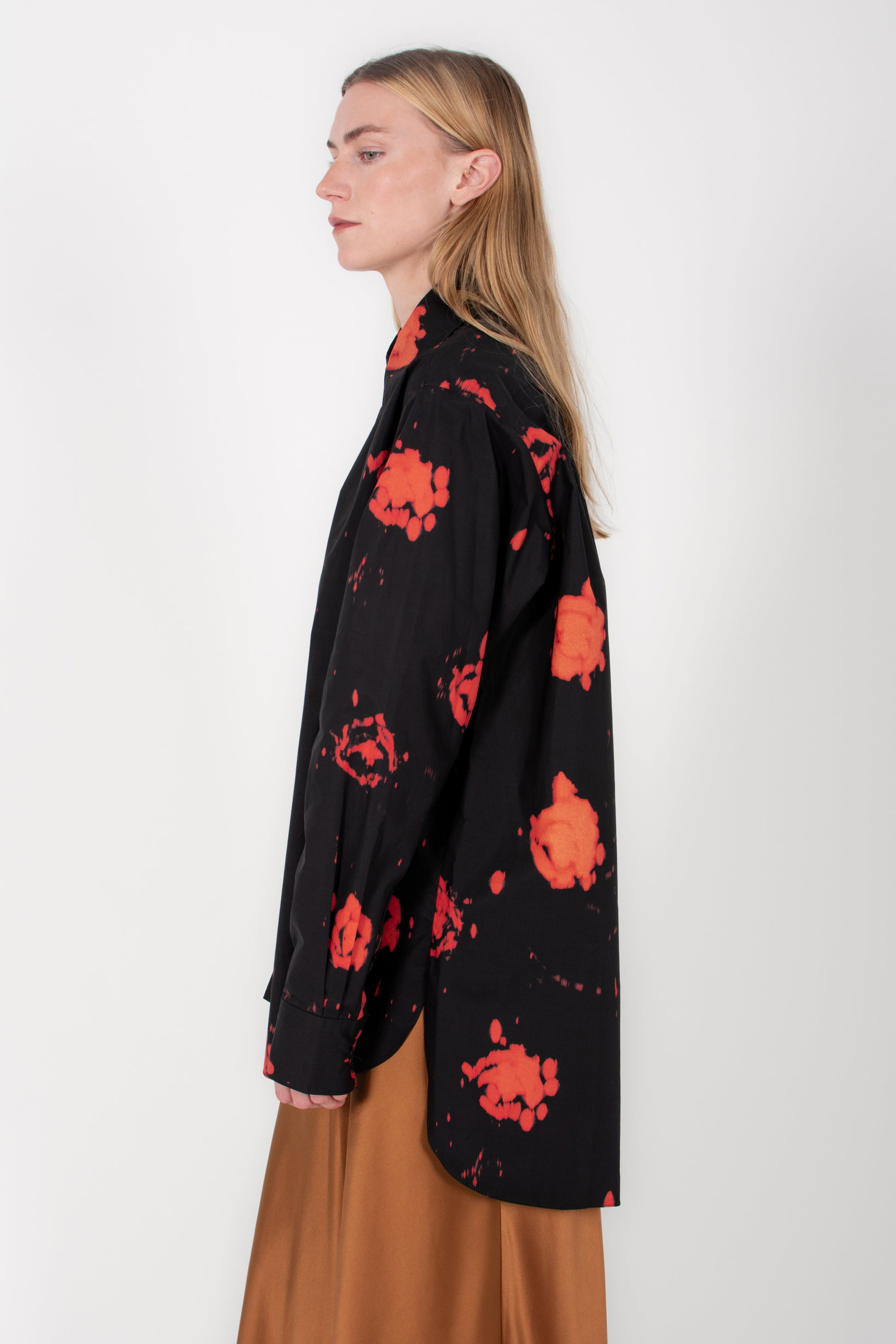 A statement take on a timeless silhouette. The Kate Button Up is crafted from 100% cotton and features our bold Graphic Rose print in vivid red against deep black. Designed with an oversized fit, elongated cuffs, and a sharp collar, it strikes the perfect balance between structure and ease. Each piece is thoughtfully sewn in New York City, celebrating modern craftsmanship with an expressive edge.