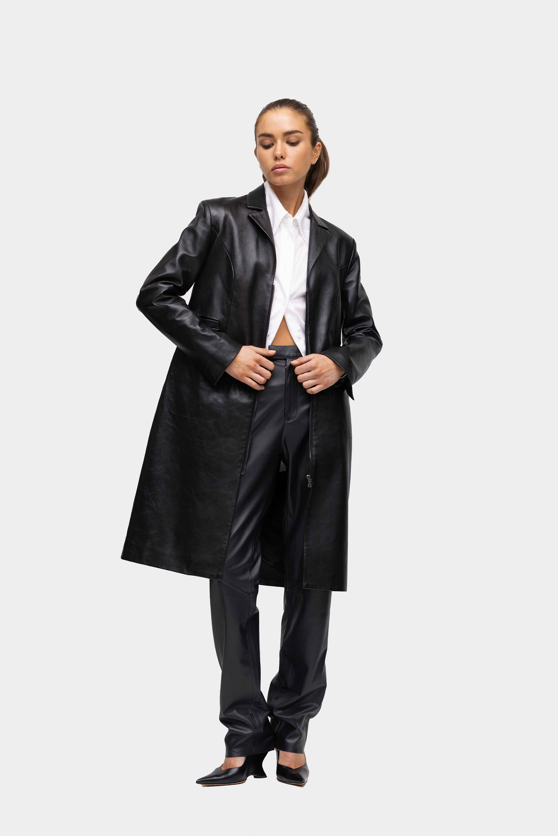 Our Linear mid-length leather jacket is cut to a regular fit and below knee length. Crafted from soft lambskin and complete with a 5-pocket tailored construction and center back slit.