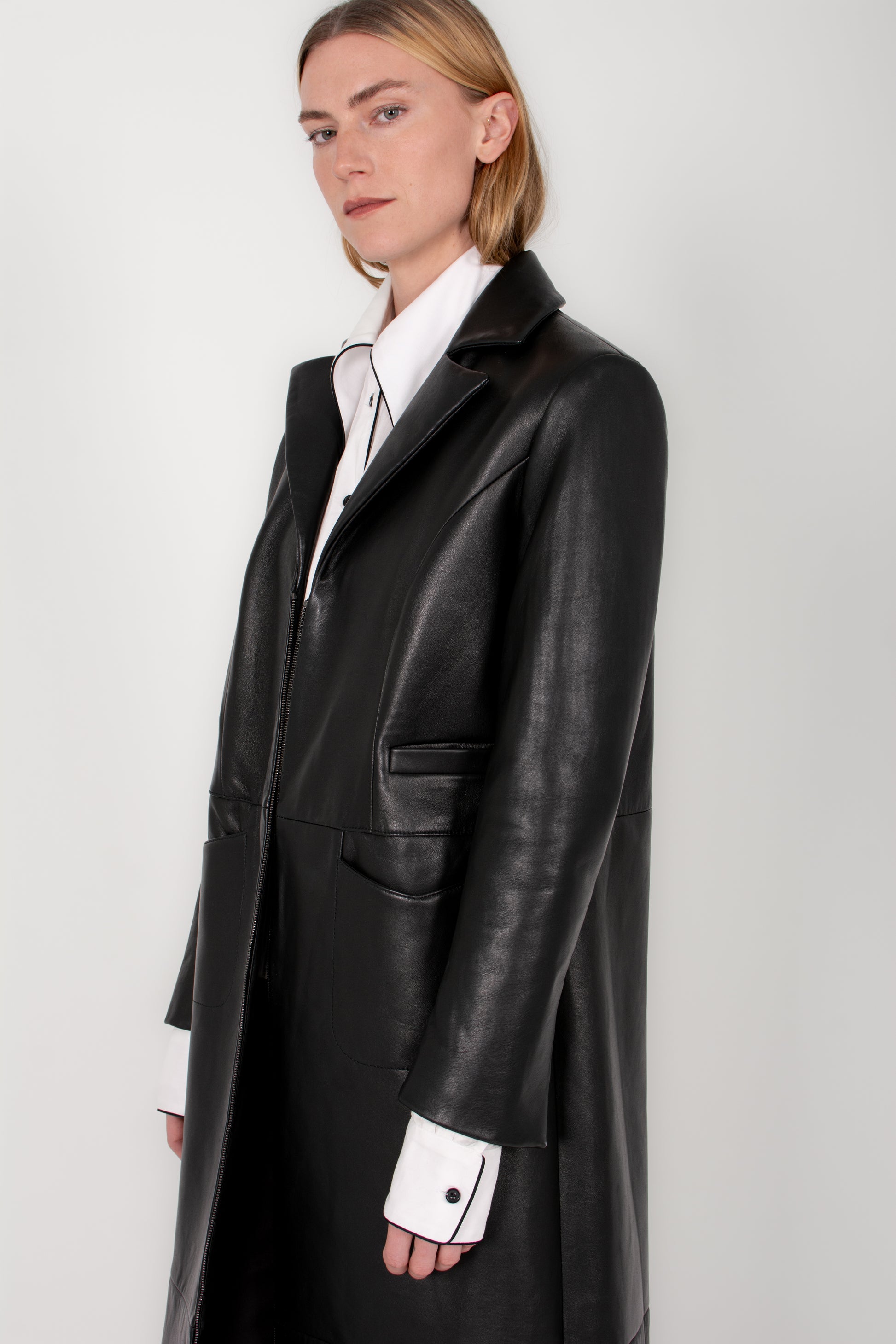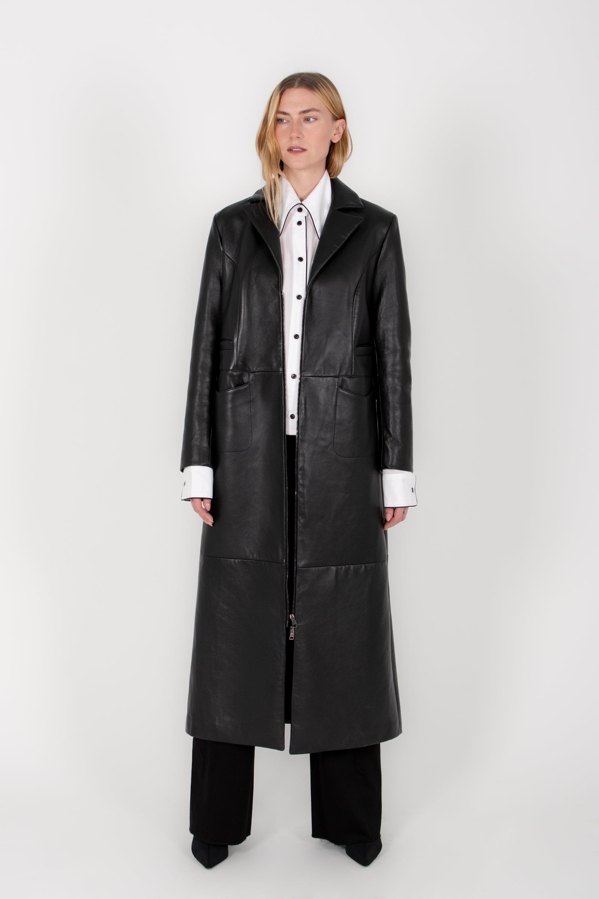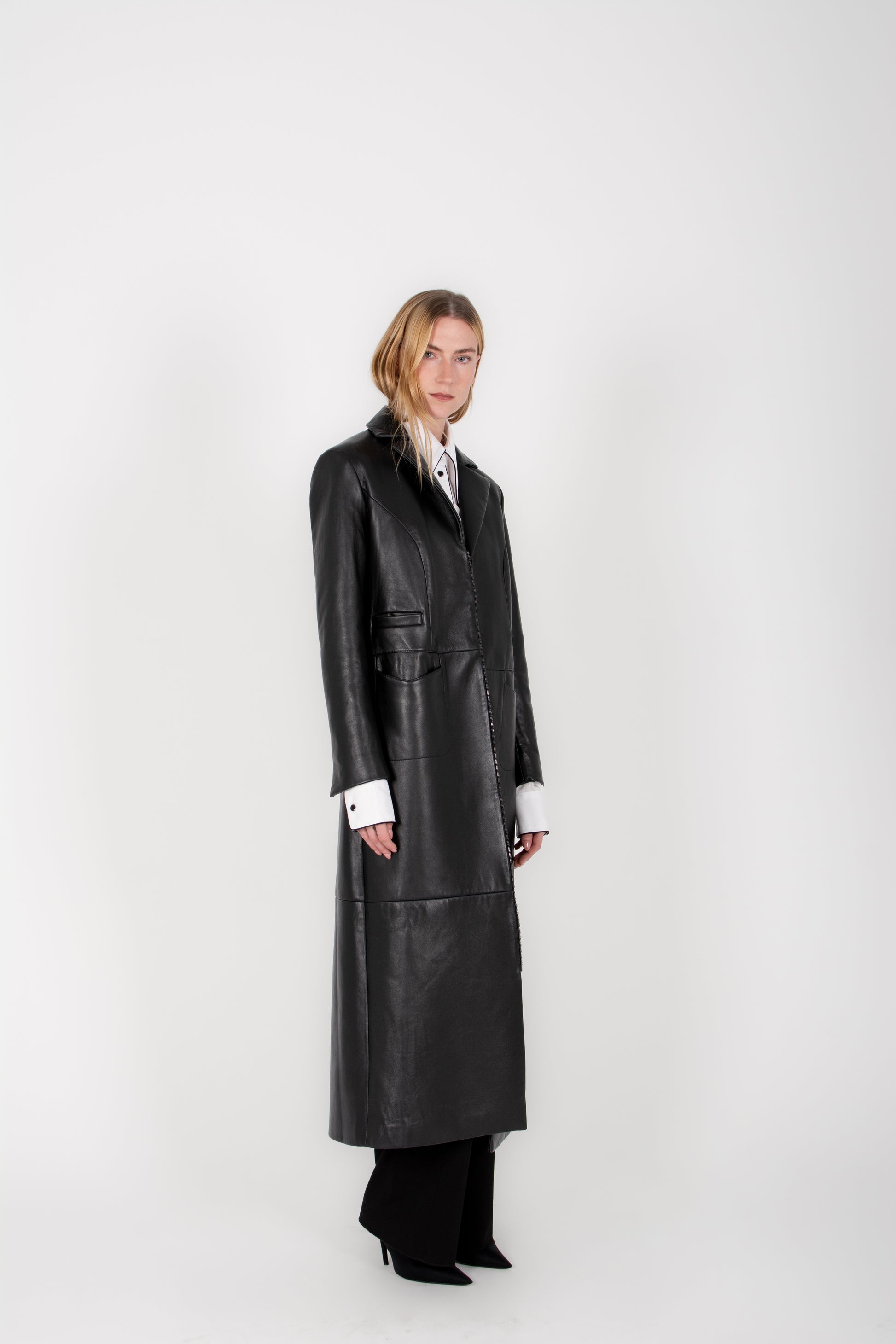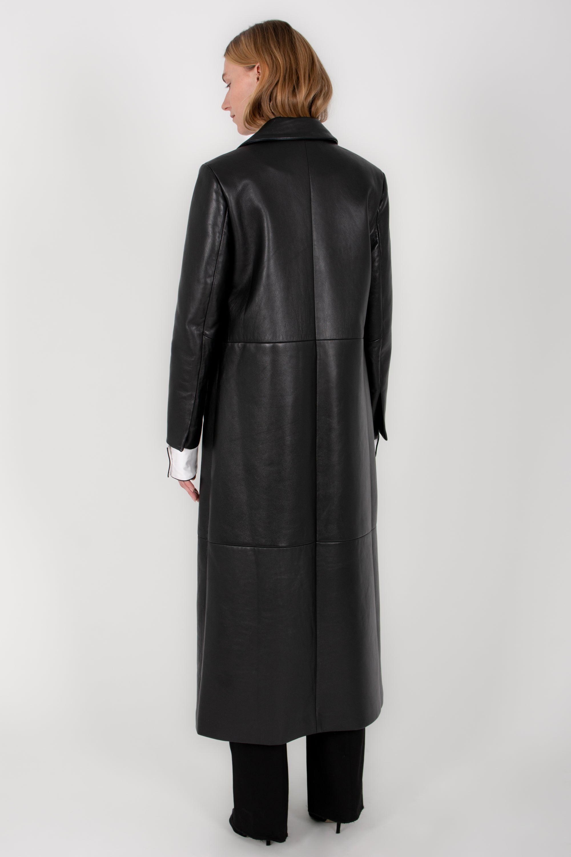 Clean, architectural, and quietly commanding, the Linear Coat brings modern structure to classic leather outerwear. Crafted from exceptionally soft lambskin, this full-length coat offers a supple drape while maintaining a strong, elongated silhouette.
