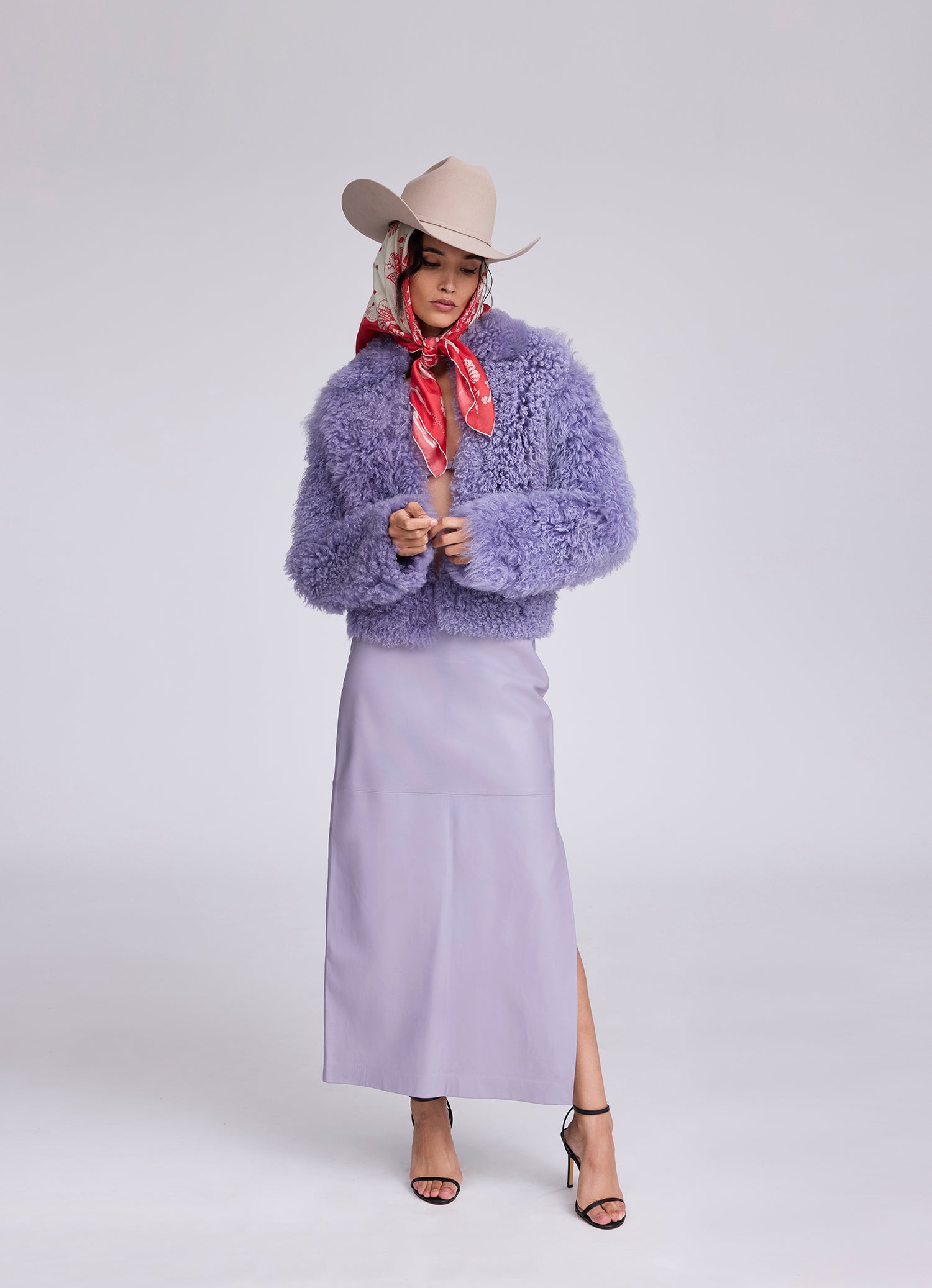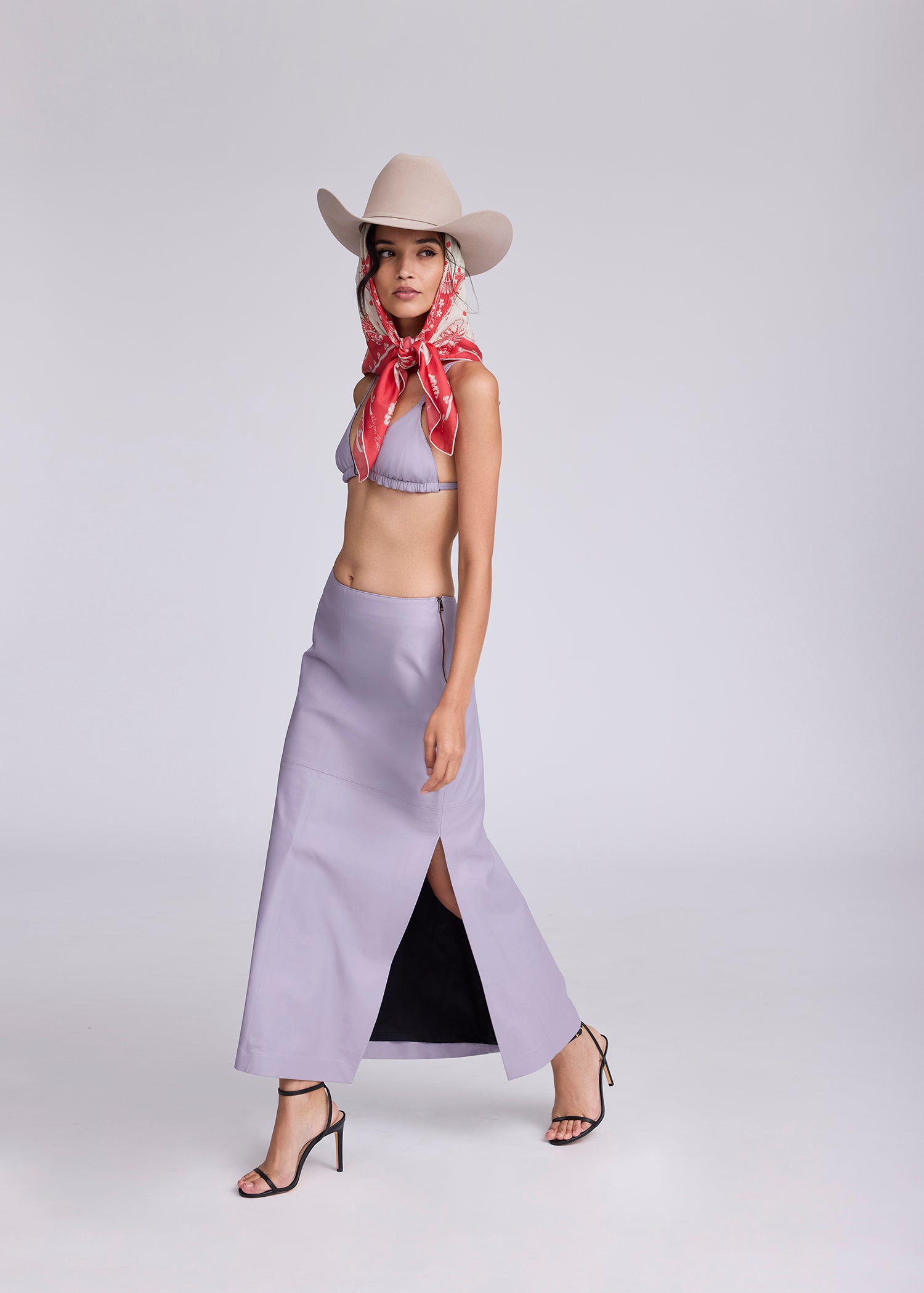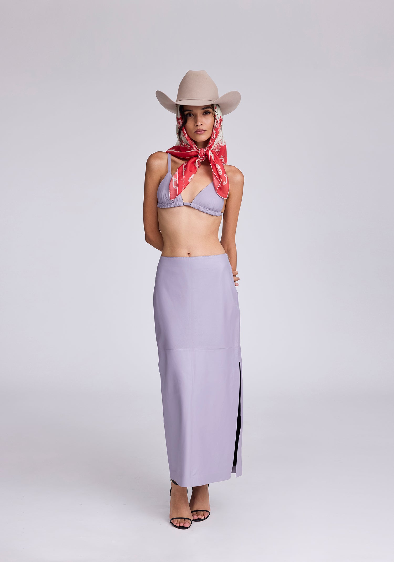 Sleek and sculptural, the Marni Skirt is crafted from buttery Italian leather in a soft lilac tone. This high-waisted column silhouette features clean paneling, a minimalist waistband, and a single side slit for ease and movement. Designed to sit smoothly against the body—it's a bold, feminine foundation for both day and night.
