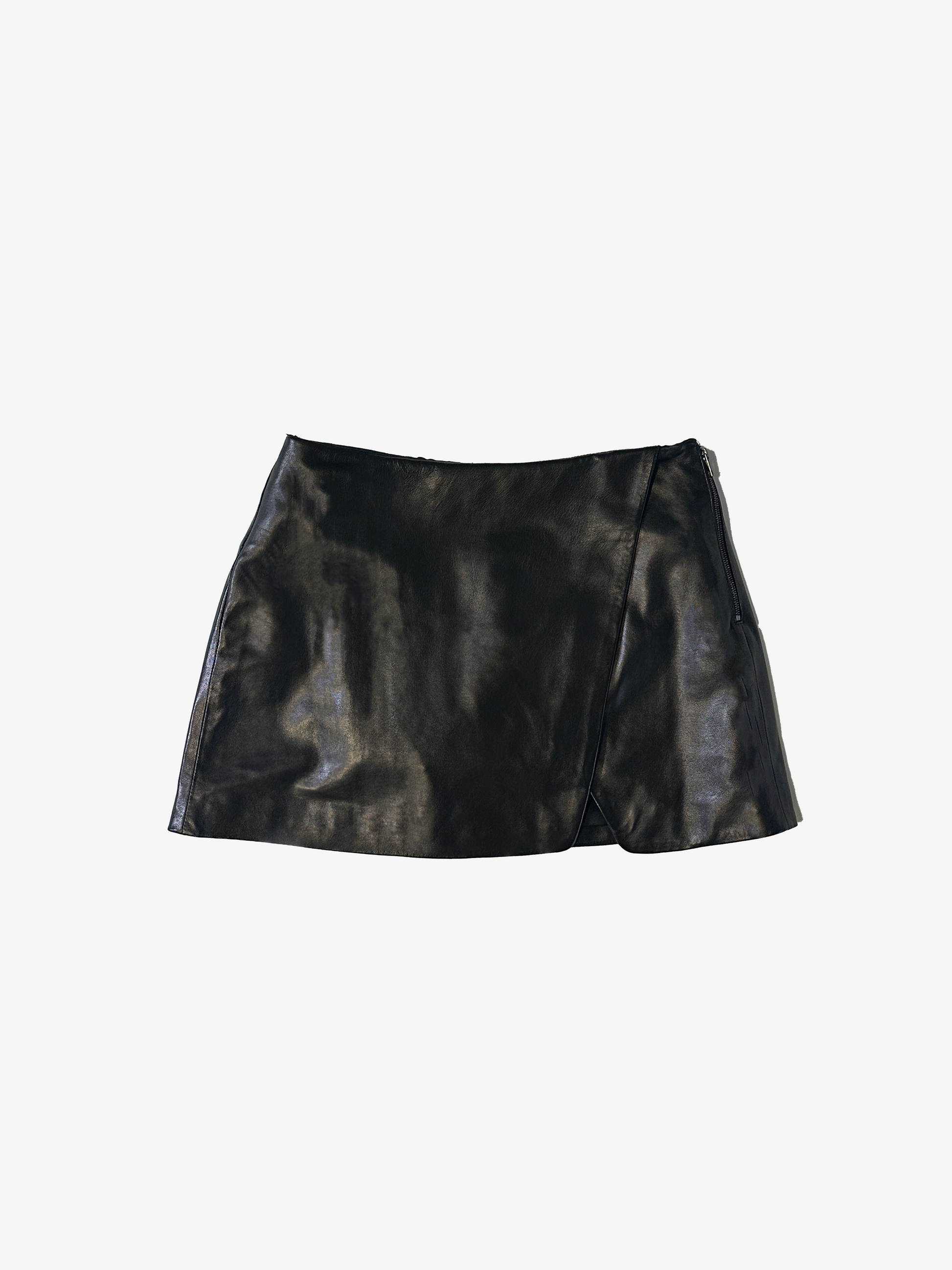 The look of a mini, the comfort of shorts. This sleek black leather skort features an asymmetrical wrap front and tailored silhouette, crafted from supple leather with a structured feel. Hidden underneath, soft knit shorts offer added comfort and ease, making it perfect for movement without compromise.