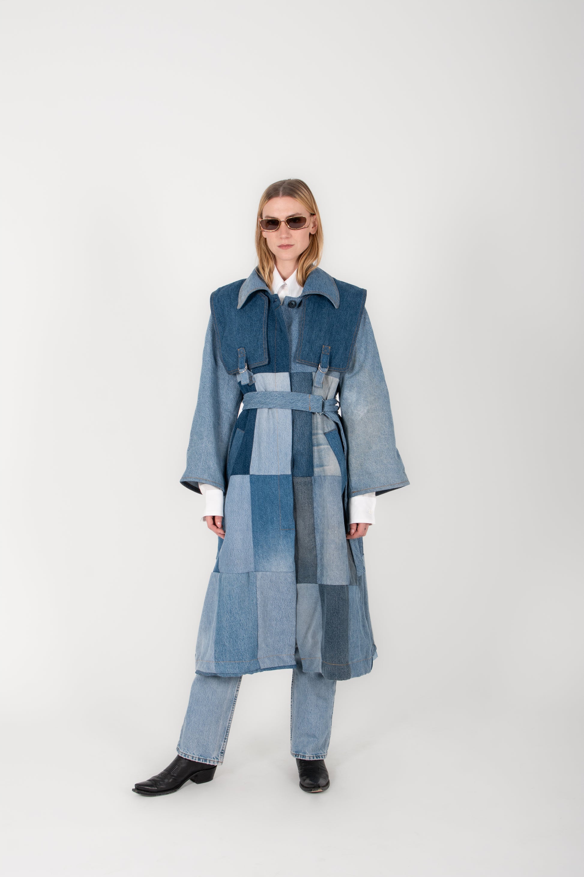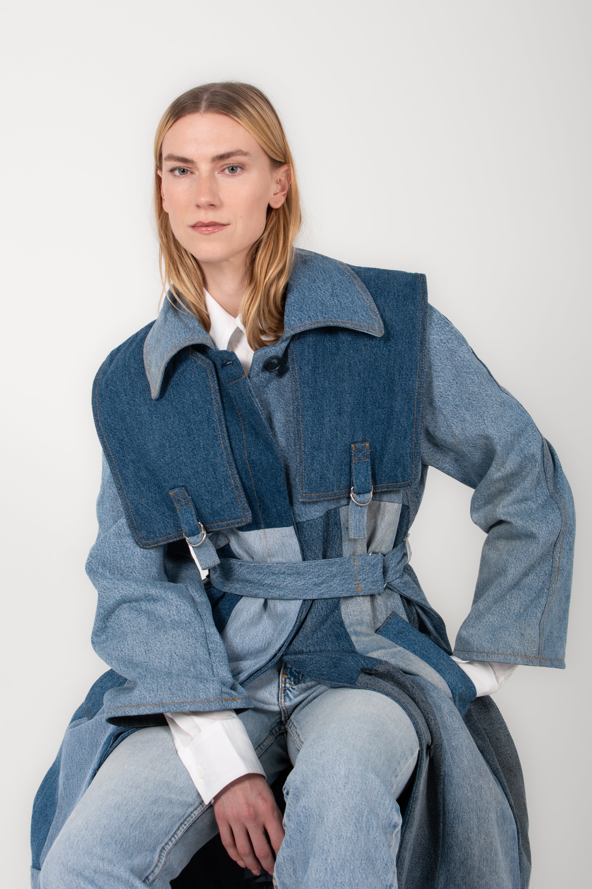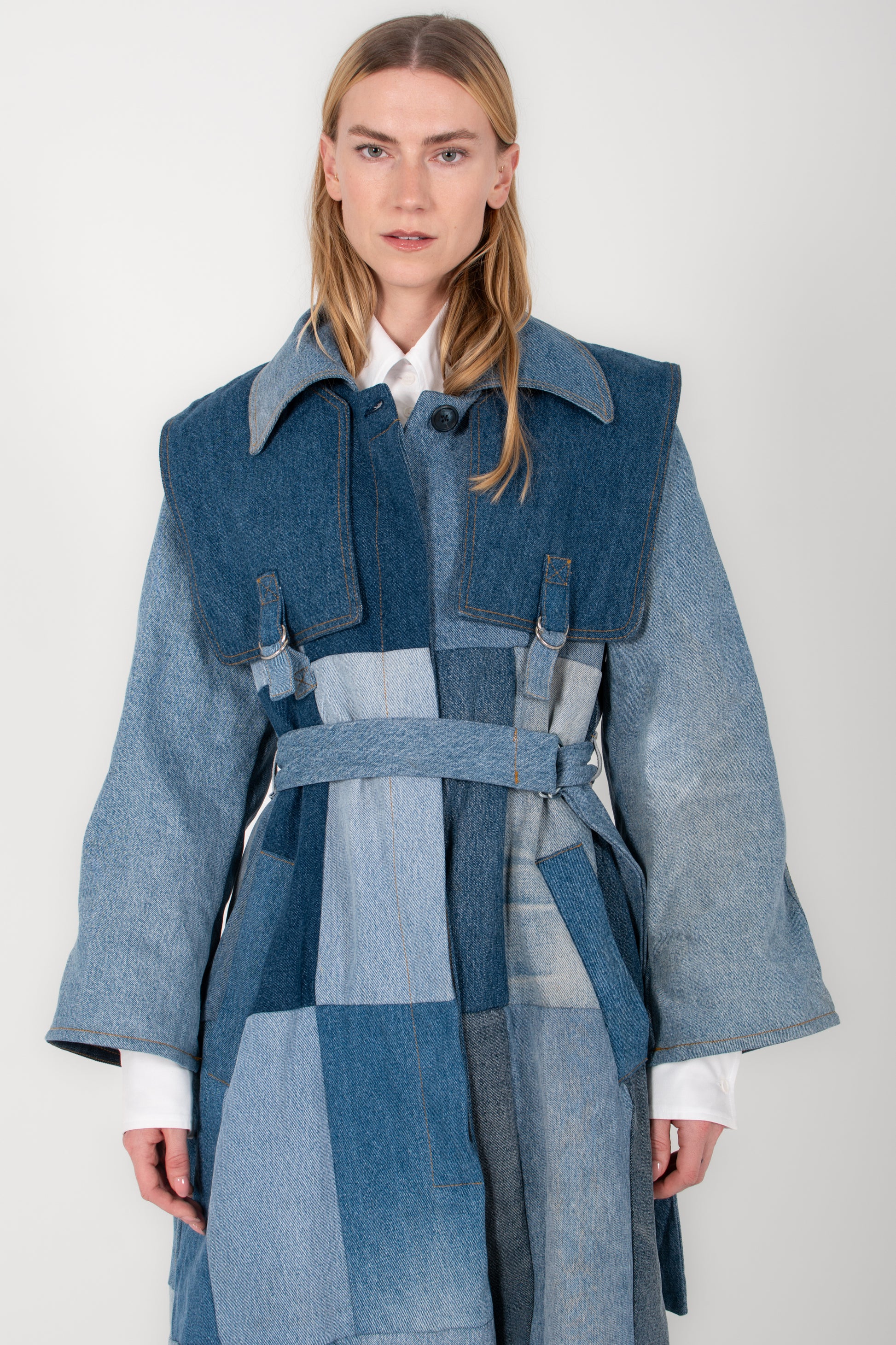 The silhouette is structured yet relaxed, featuring a wide collar, soft drape through the body, and an adjustable belt that cinches the waist with effortless ease. Oversized sleeves and thoughtful seaming add architectural dimension, while the weight of the denim offers natural warmth and presence.