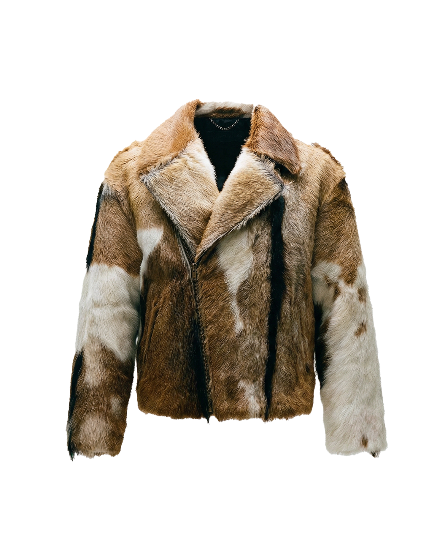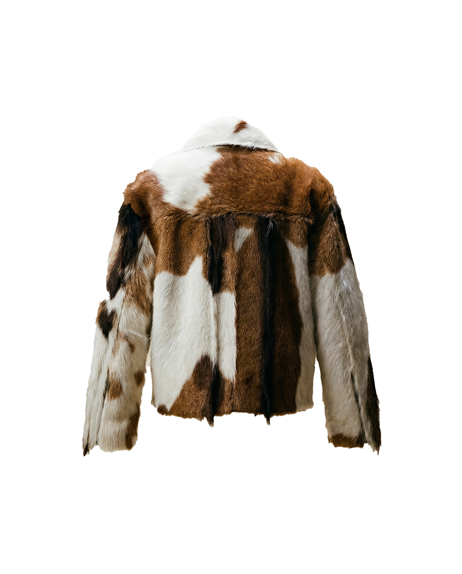 Crafted in Italy from premium hair-on goatskin leather, this one-of-a-kind jacket is entirely unique. The jacket shown in the photo is the exact piece you will receive, no duplicates, no reproductions.